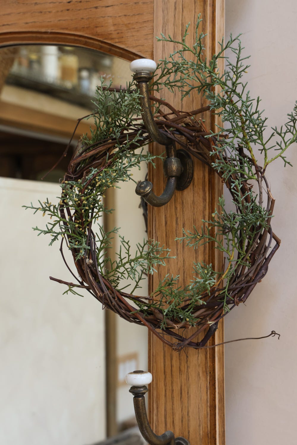 The hall tree now lives in our (only) bathroom, which is also the laundry room.